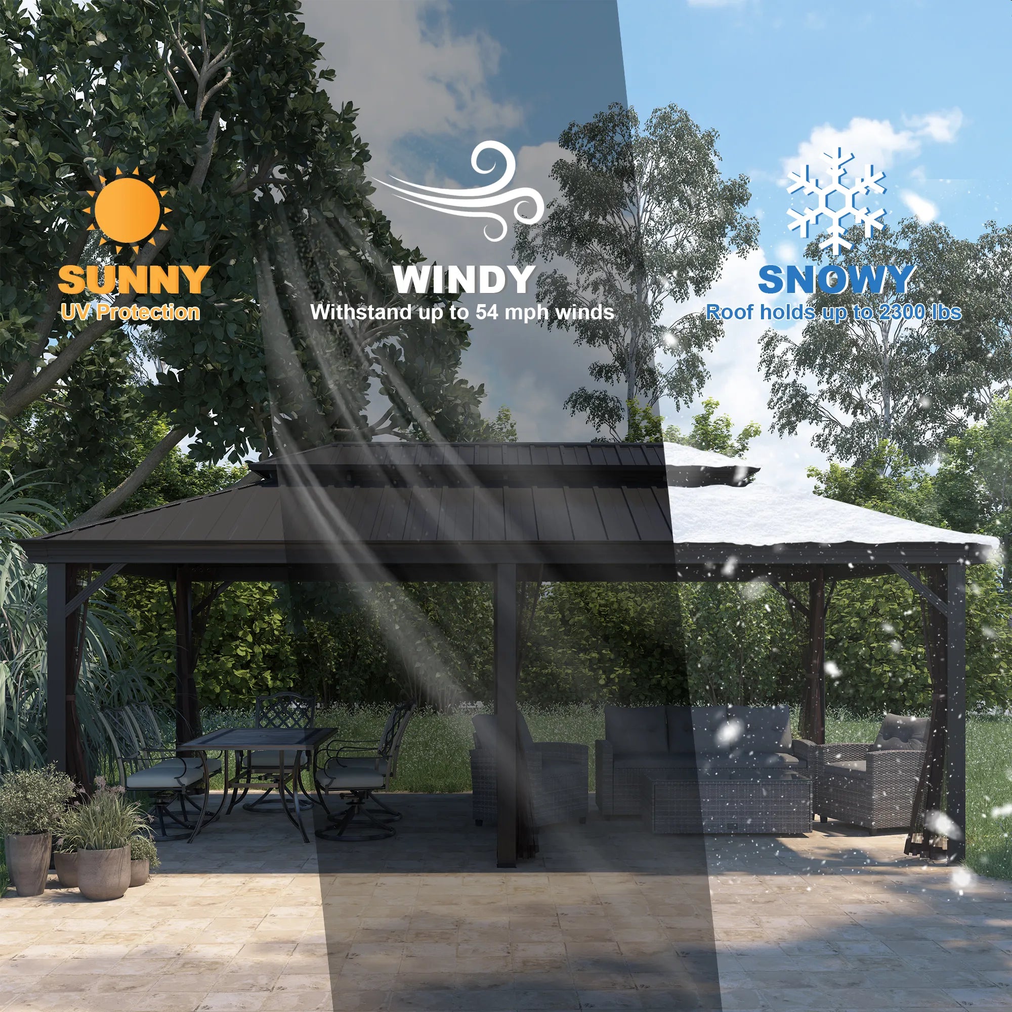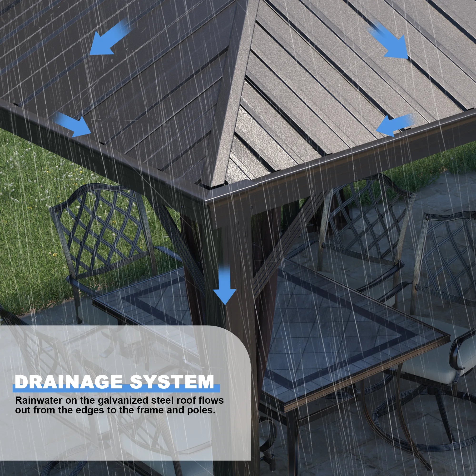 • There is a waterproof sheet on the top of the gazebo to increase waterproofness and prevent outdoor furniture from being damaged by rain.