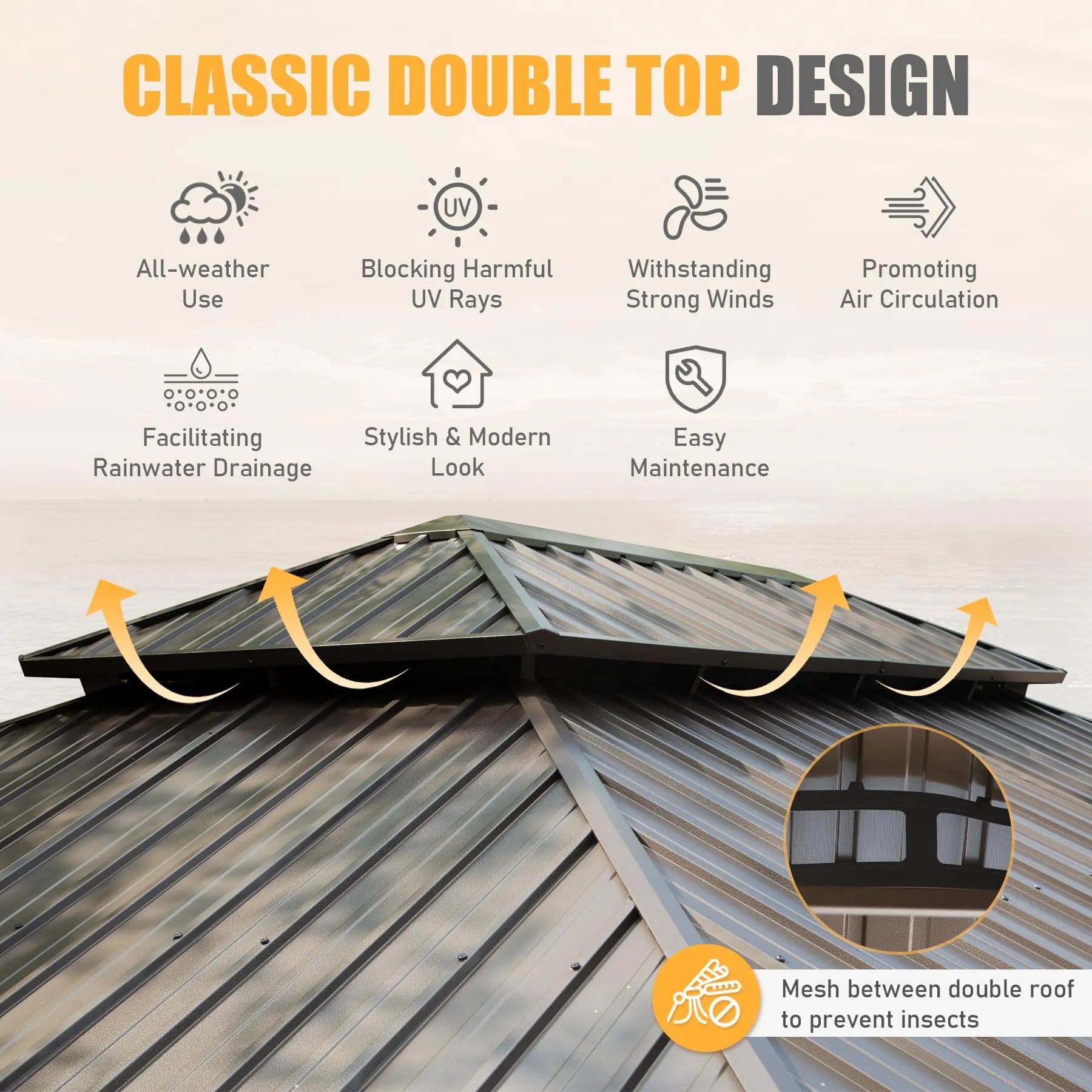• Fade and Rust Resistance- The galvanized steel metal top is fade-resistant and rust-resistant, prolonging the life of the aluminum gazebo.