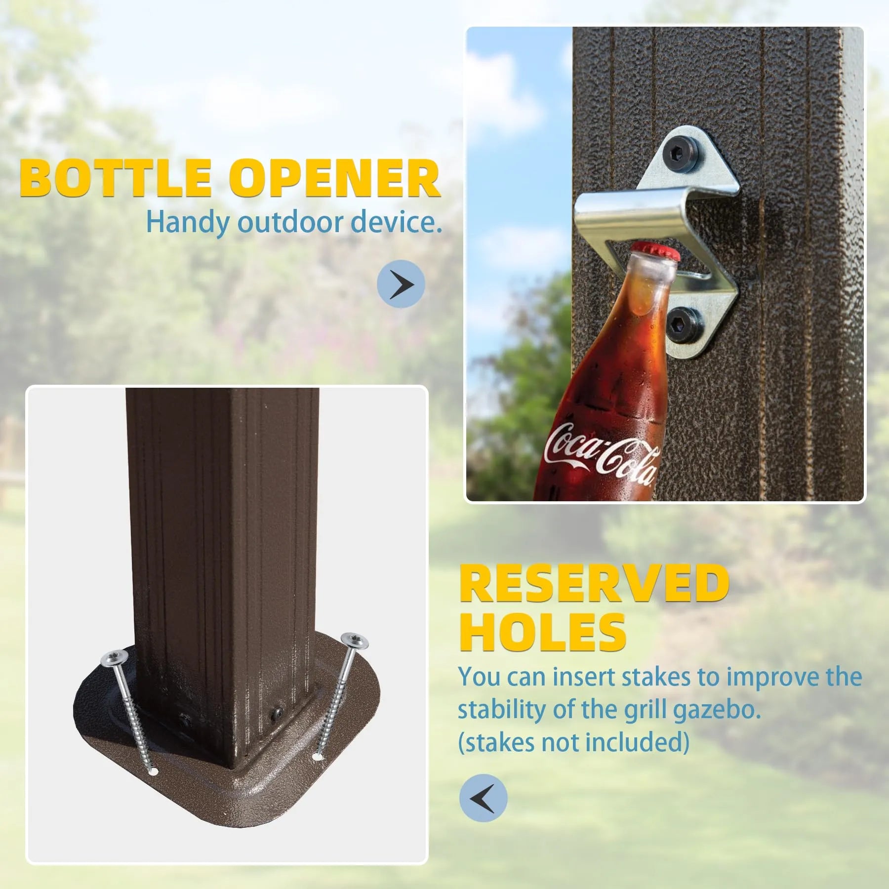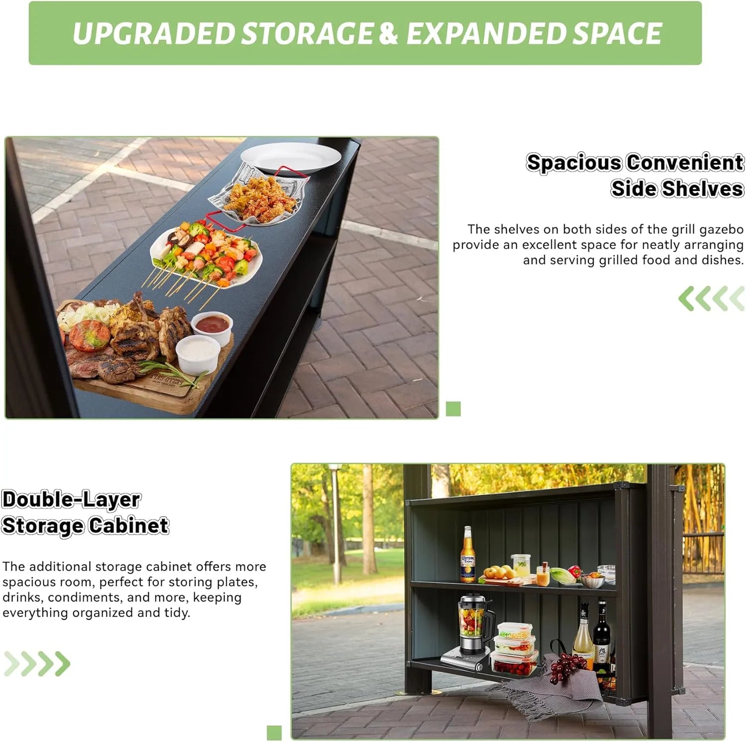 • Convenient Side Shelves- The bbq gazebo comes with two built-in side shelves, offering ample space for food and drink preparation. These shelves help keep your grilling essentials organized and within reach, making your outdoor cooking experience more efficient and enjoyable.