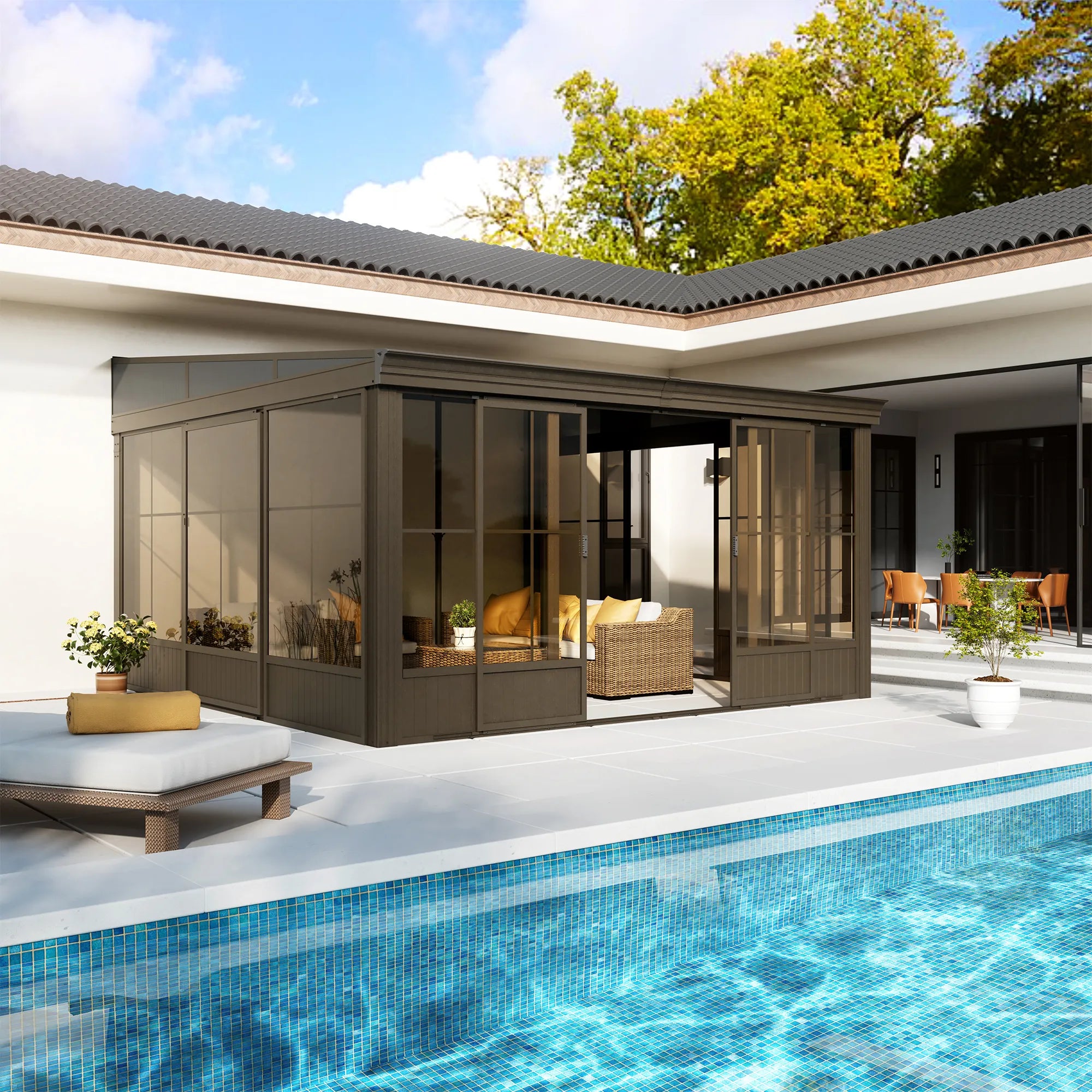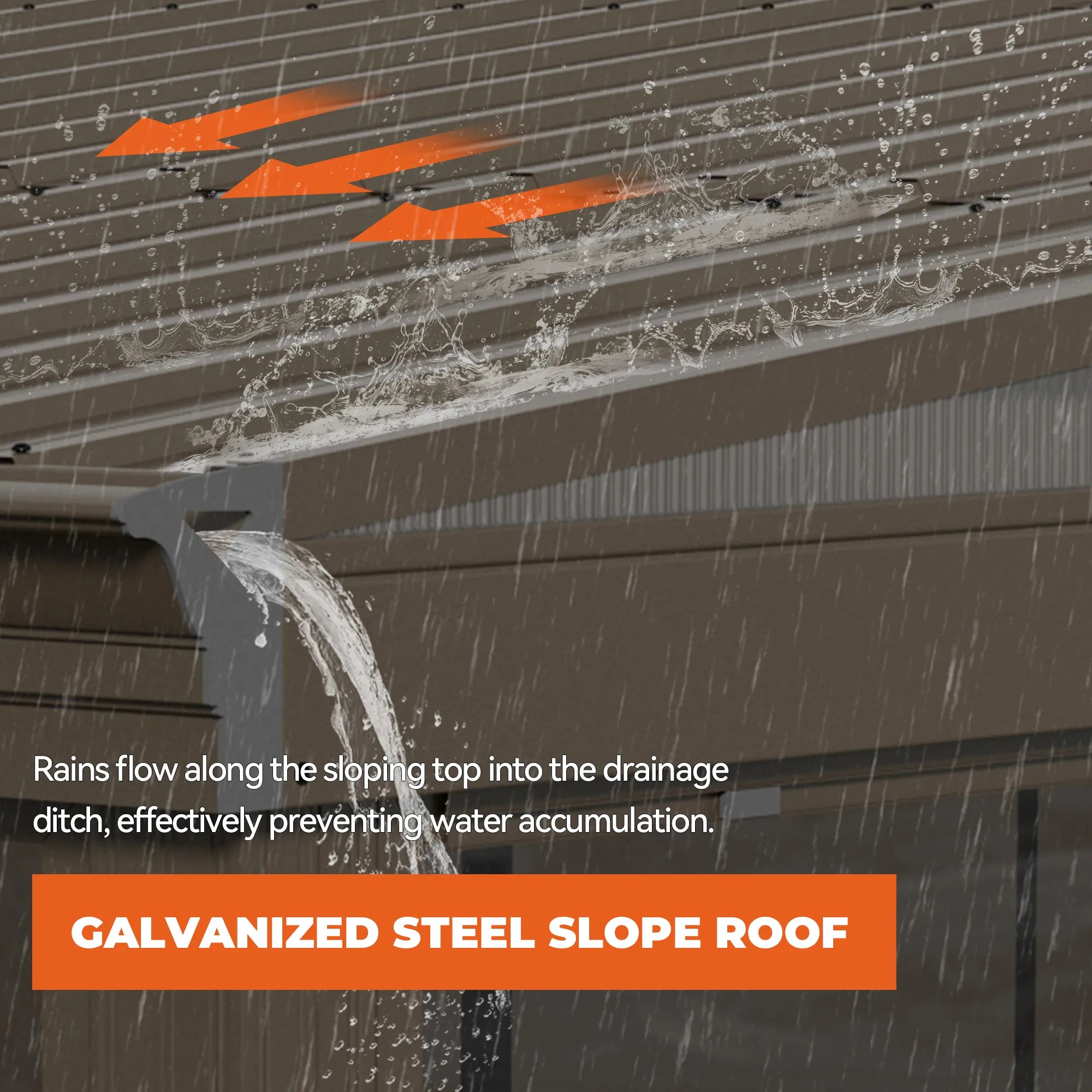 【Galvanized Steel Slope Roof】The 12'x14' sunroom with its crafted sloped roof and integrated drainage system, offers effective management of rainwater and snow to keep your patio furniture protected and allow you to enjoy the outdoors in any weather.