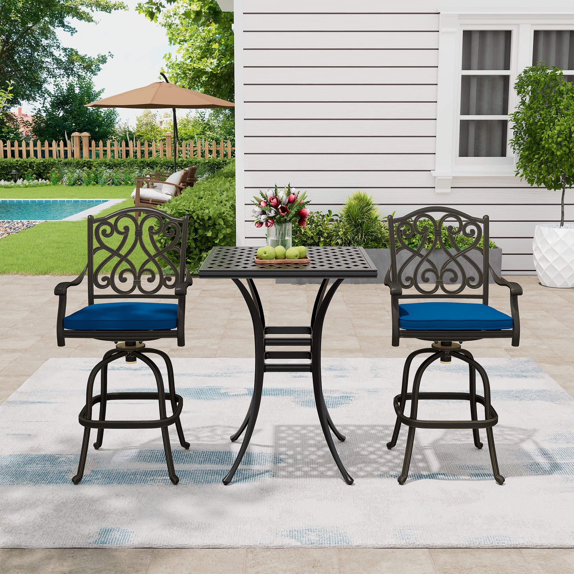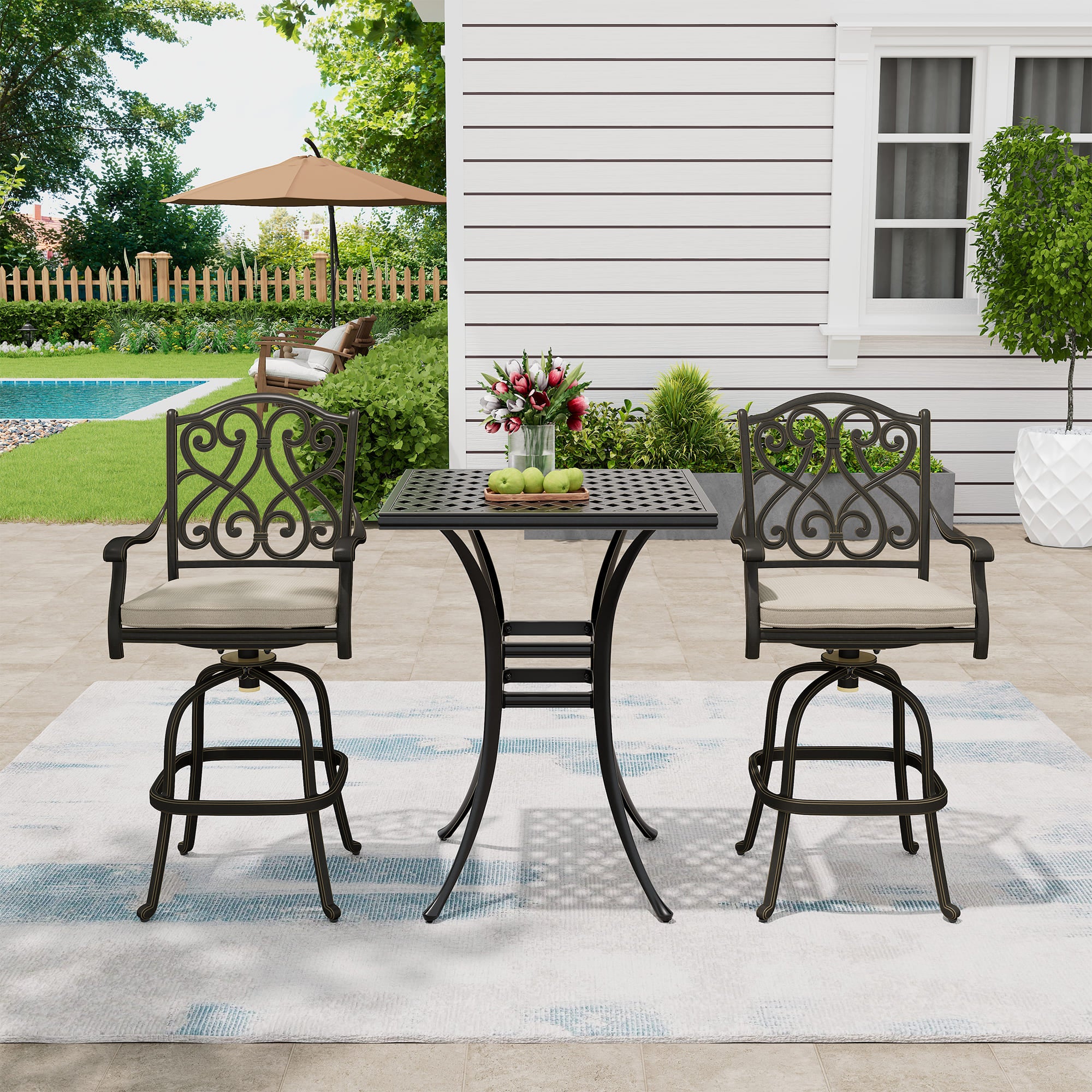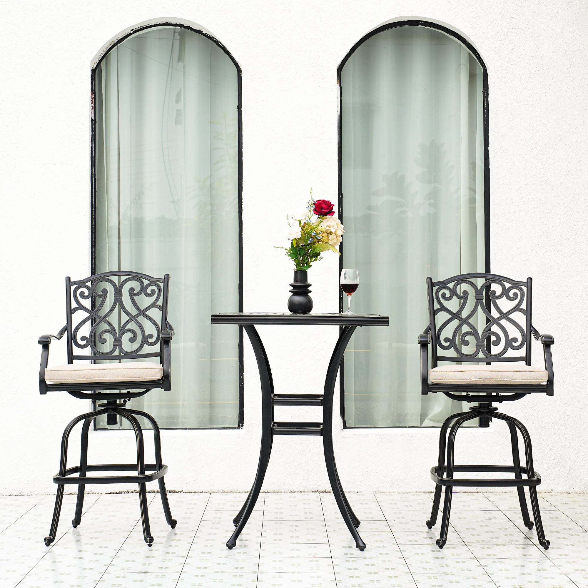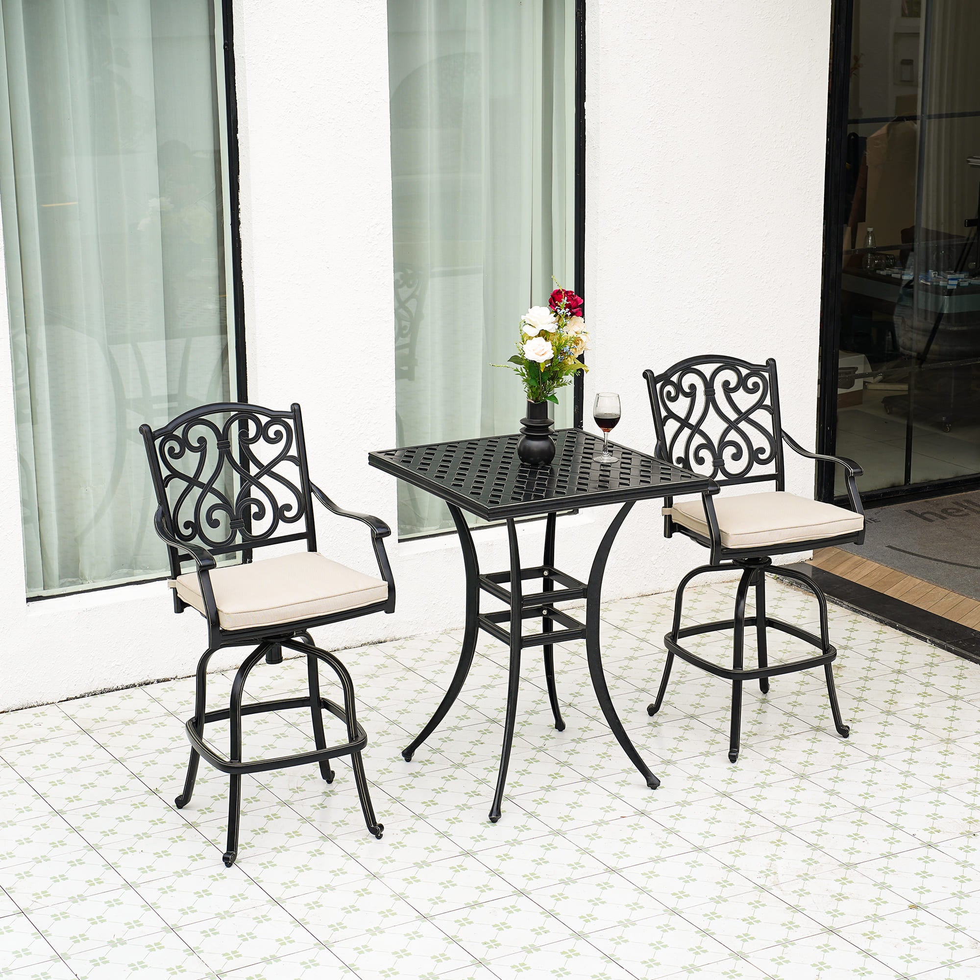 Indulge in luxury with our 3-piece Patio Bistro Set. Crafted with wear-resistant, rustproof cast aluminum framing, each piece exudes timeless elegance. Enjoy ultimate comfort with 360° swivel chairs and 5 cm thick olefin cushions. Elevate your outdoor space with vintage-inspired design and ergonomic chairs. Unwind and cherish outdoor moments with loved ones. Includes 1 square dining table and 2 swivel chairs, delivered in 2 boxes for your convenience.