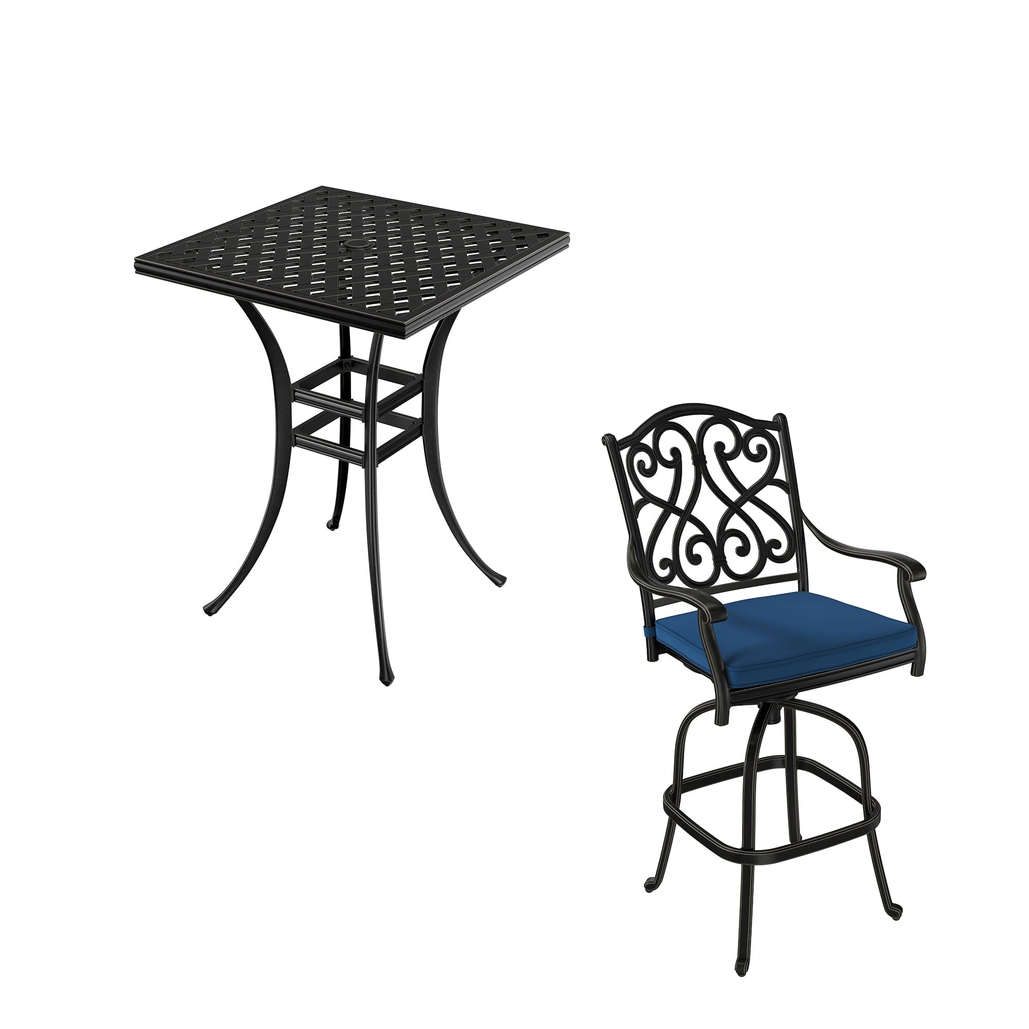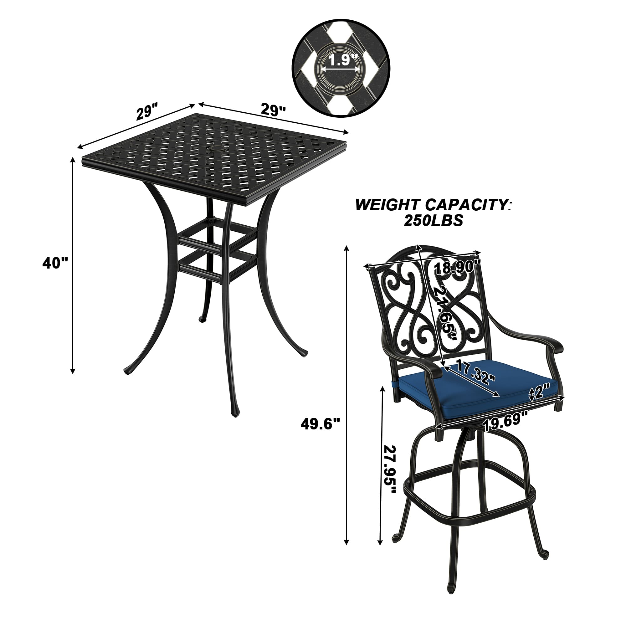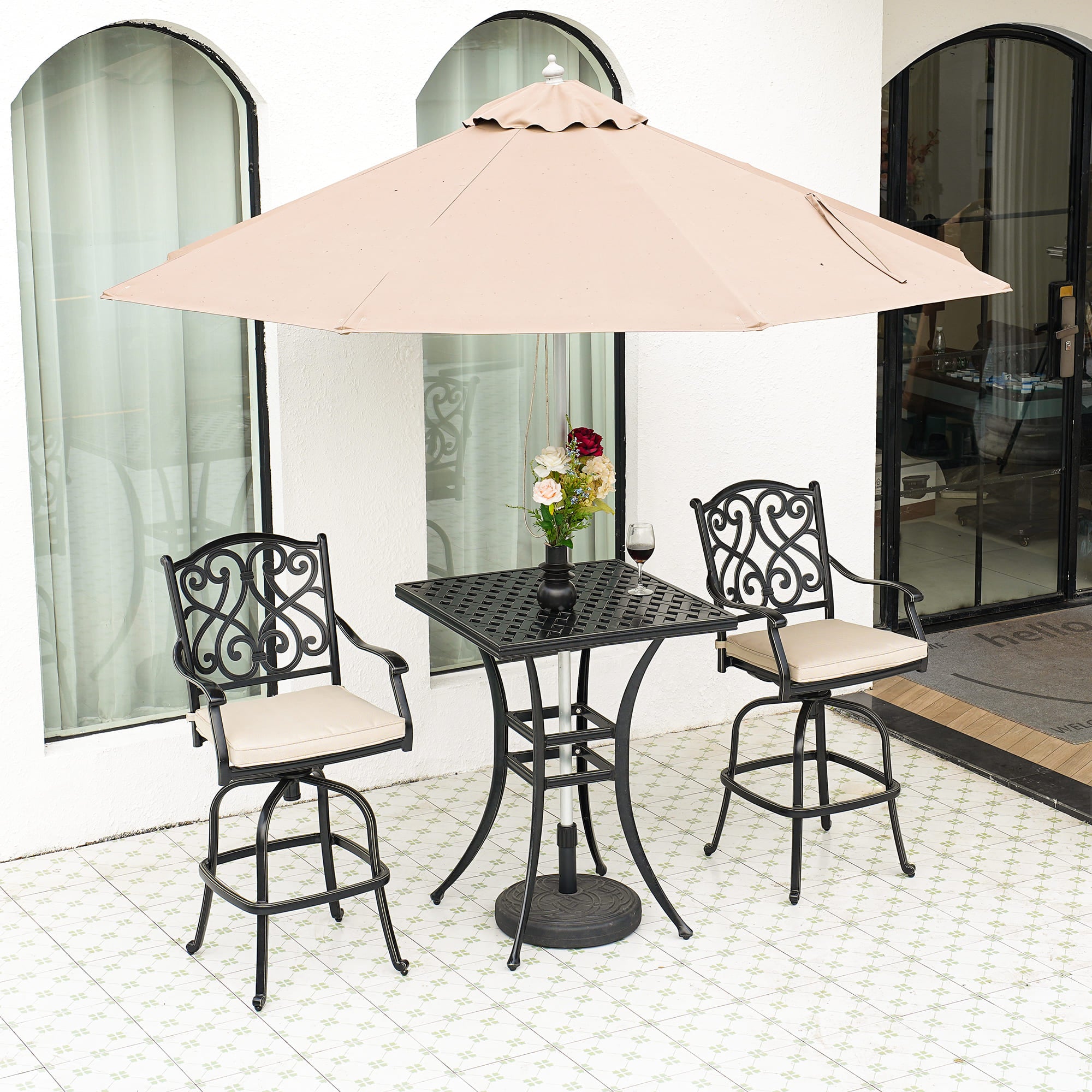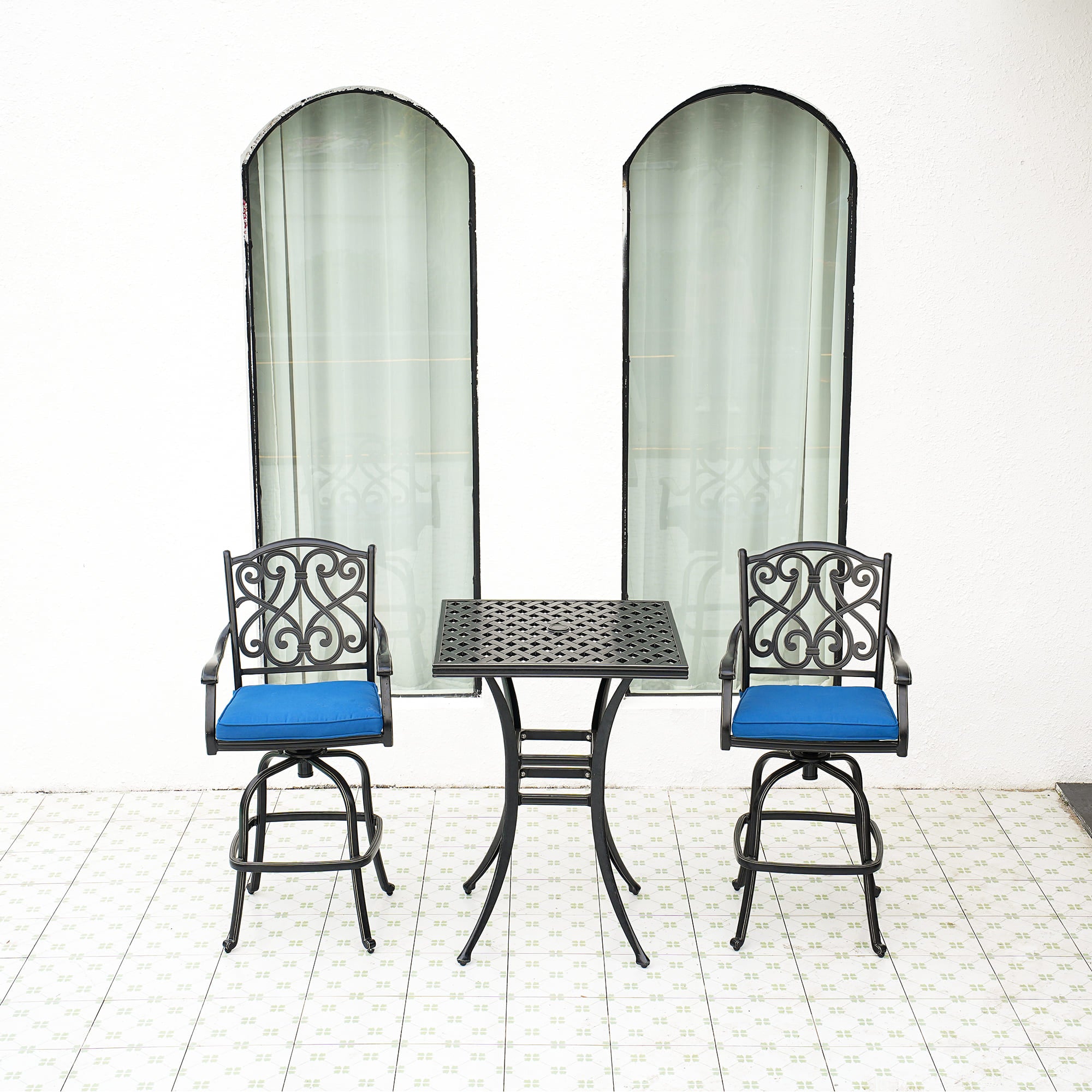Indulge in luxury with our 3-piece Patio Bistro Set. Crafted with wear-resistant, rustproof cast aluminum framing, each piece exudes timeless elegance. Enjoy ultimate comfort with 360° swivel chairs and 5 cm thick olefin cushions. Elevate your outdoor space with vintage-inspired design and ergonomic chairs. Unwind and cherish outdoor moments with loved ones. Includes 1 square dining table and 2 swivel chairs, delivered in 2 boxes for your convenience.