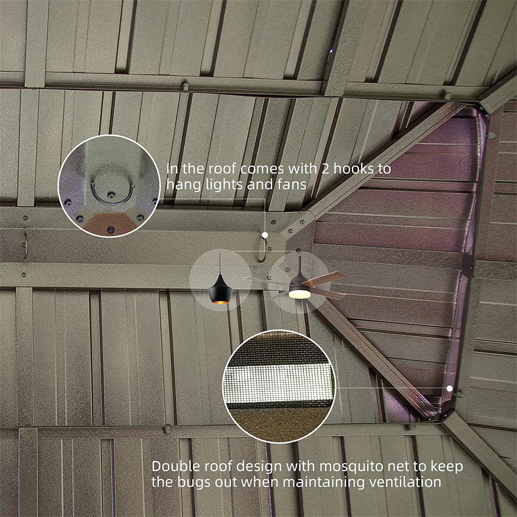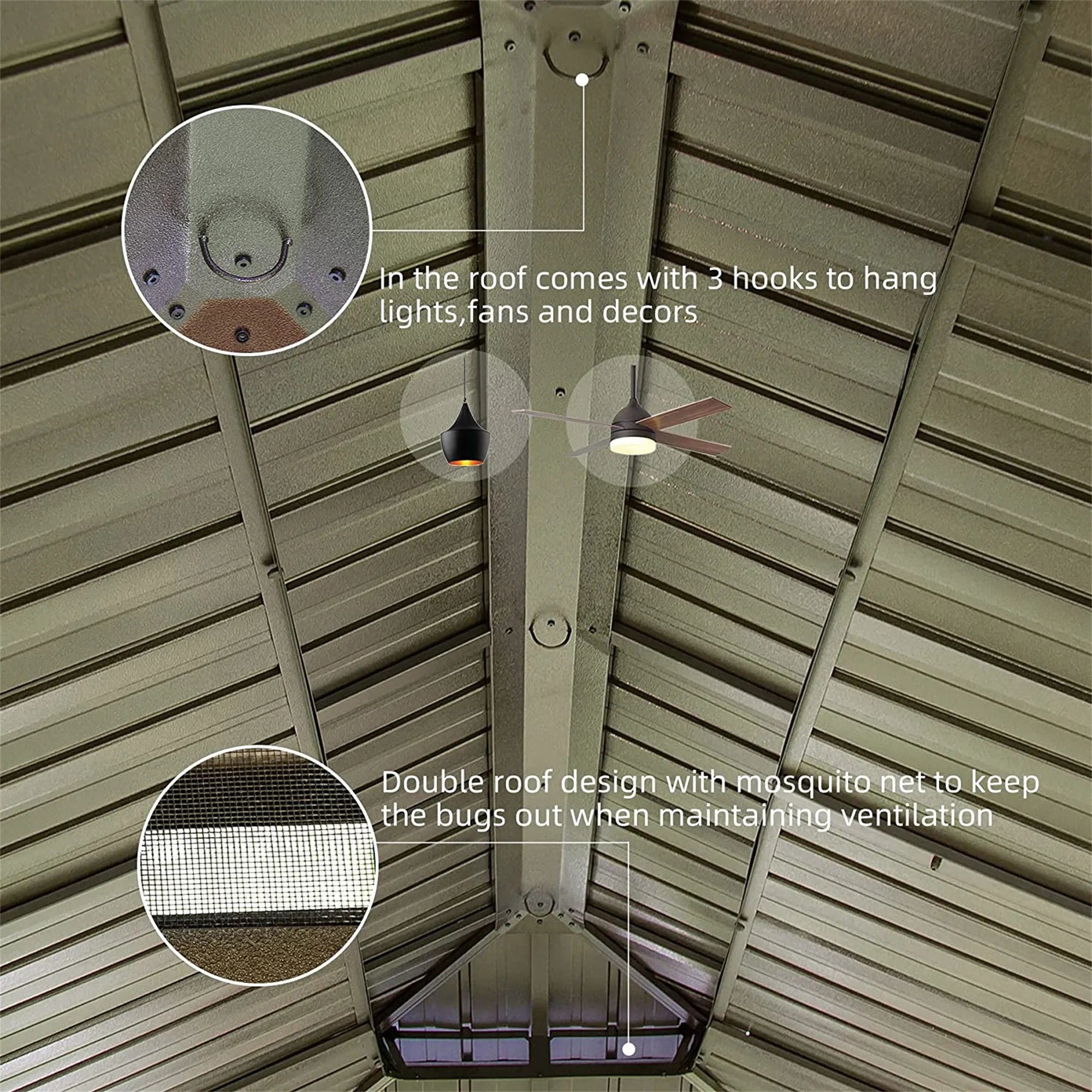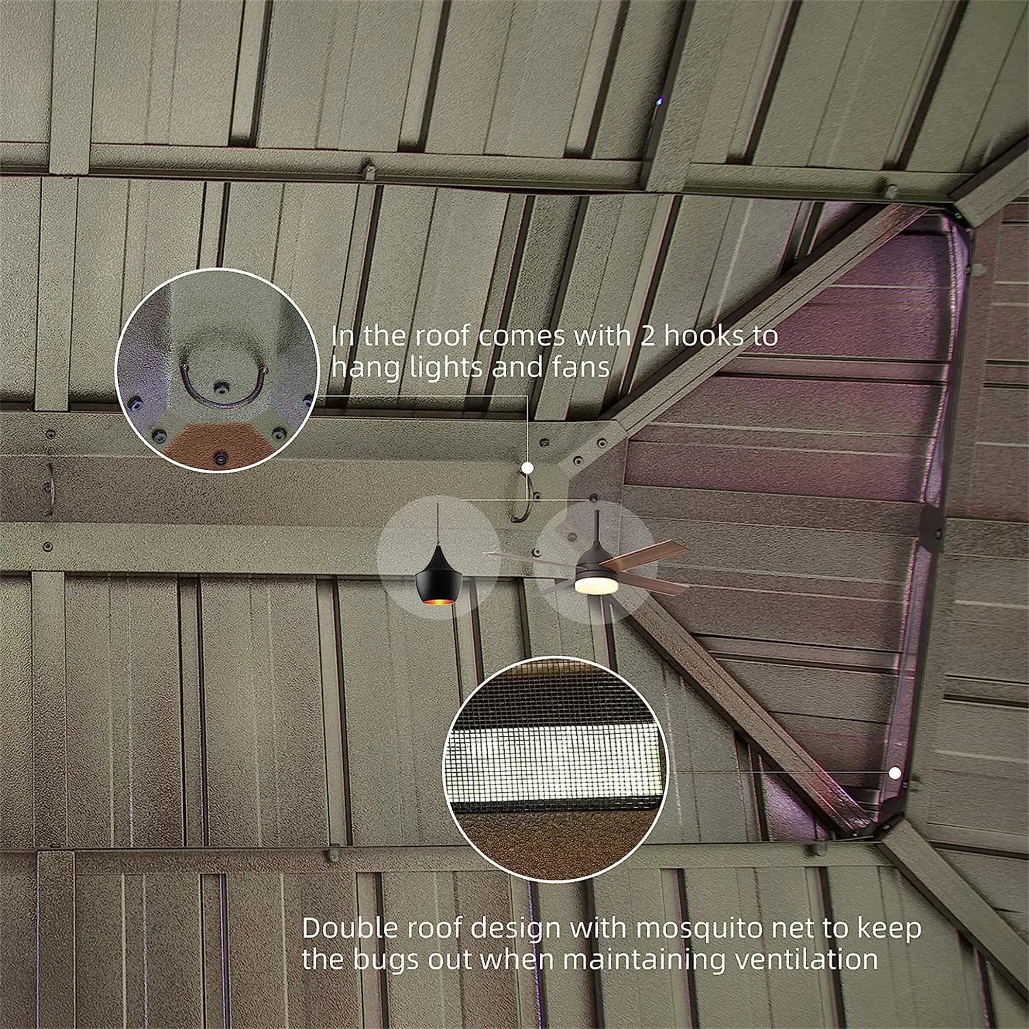 1. Galvanized Steel Double Roof: W10ftxL12ft(120inchx144inch), Fade-resistant and rust-resistant galvanized steel top, keeps out bright light and harmful UV rays, strong enough to withhold windy or heavy snow. which is not possible with traditional soft-top gazebos.