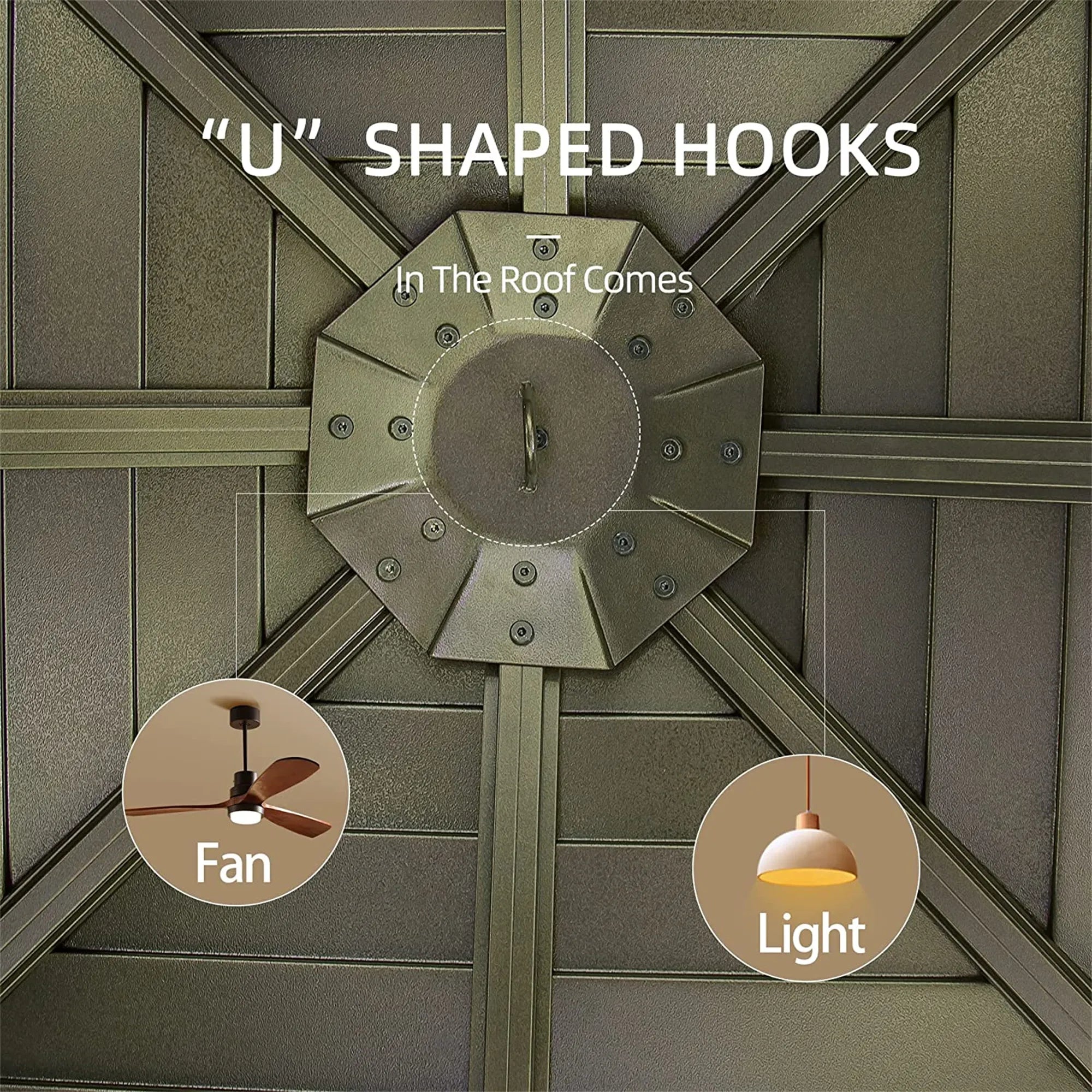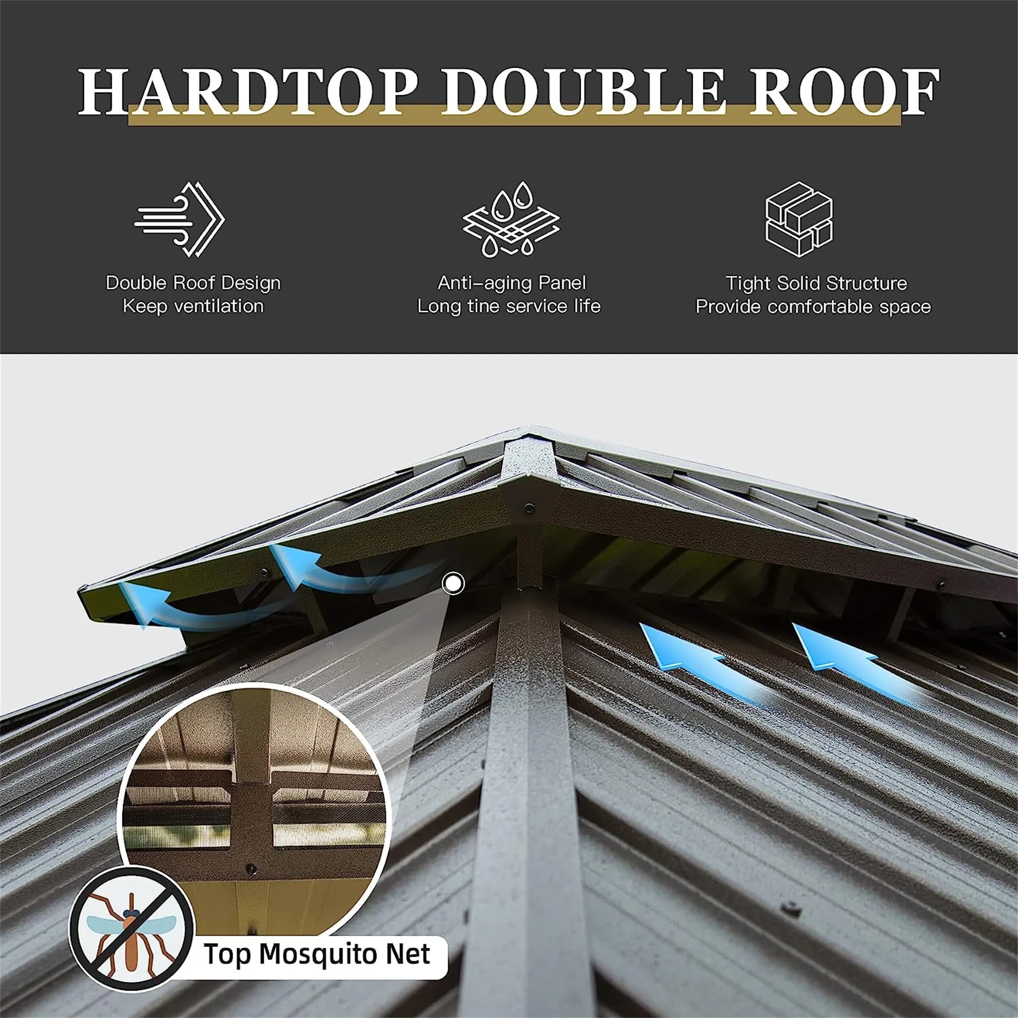 6. Netting And Curtains: Our permanent hardtop gazebo sports a dual-slide design that features zippered, double-layered sidewalls. These sidewalls provide added protection, including sunlight, UV, rain, snow, and mosquitoes - and they enhance privacy too. Enjoy a safe, comfortable environment in your outdoor hardtop gazebo.